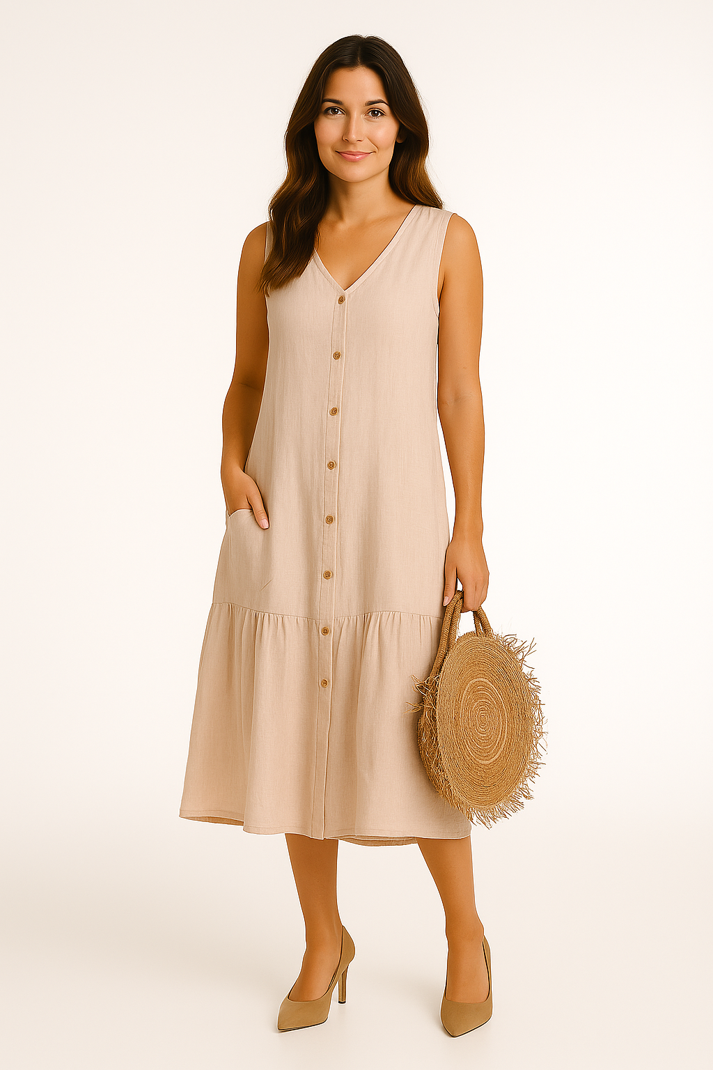 Løft sommergarderoben din med Maria ermeløs midikjole med knapper - der tidløs eleganse møter moderne komfort.
