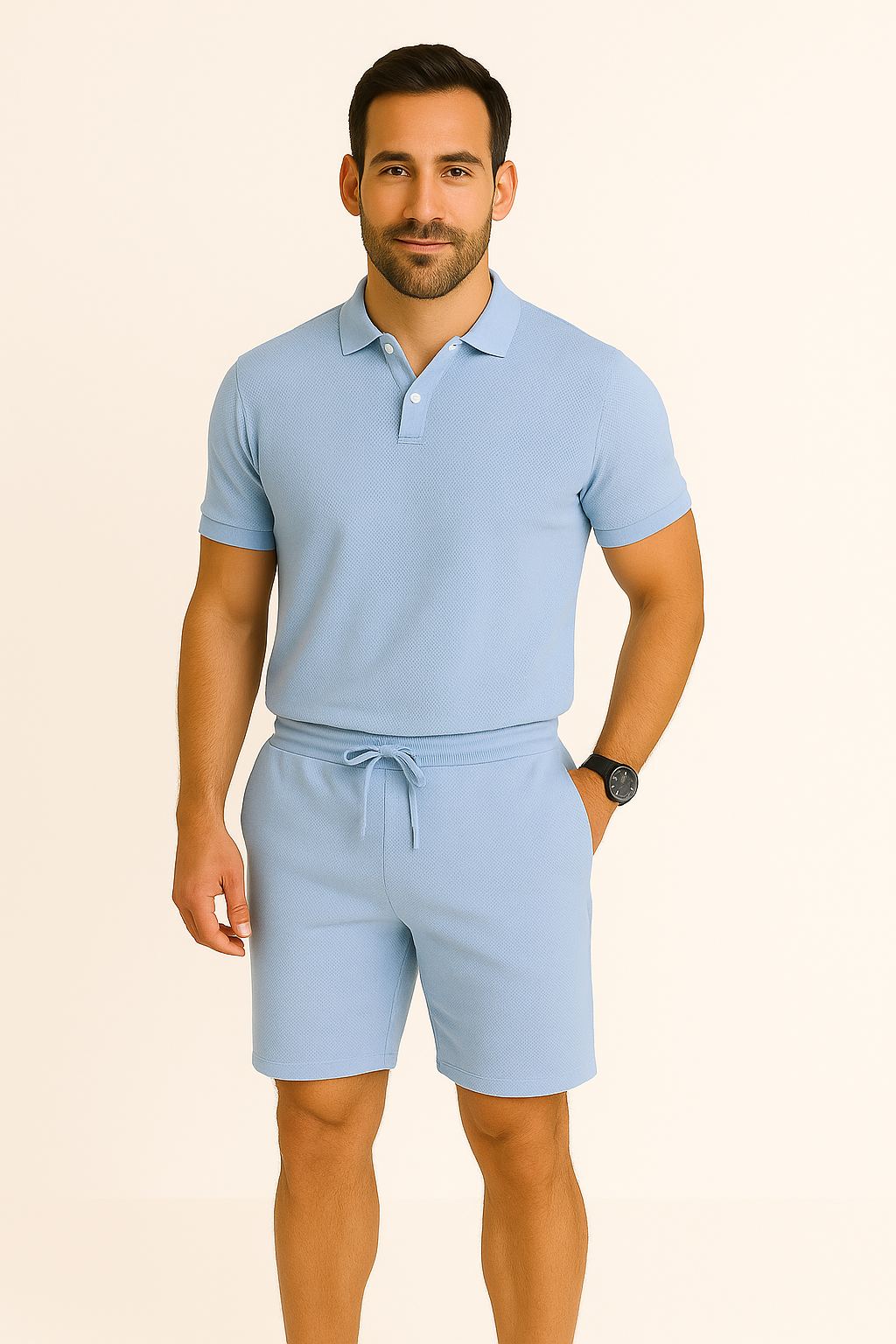 Dette settet med poloskjorte og shorts er den perfekte kombinasjonen av moderne stil og komfort. Designet for de som setter pris på et upåklagelig utseende uten å gi avkall på bevegelsesfriheten, er det ideelt for aktive dager eller avslappende stunder. Den tettsittende passformen fremhever den maskuline silhuetten, og det myke stoffet garanterer en frisk følelse hele dagen.